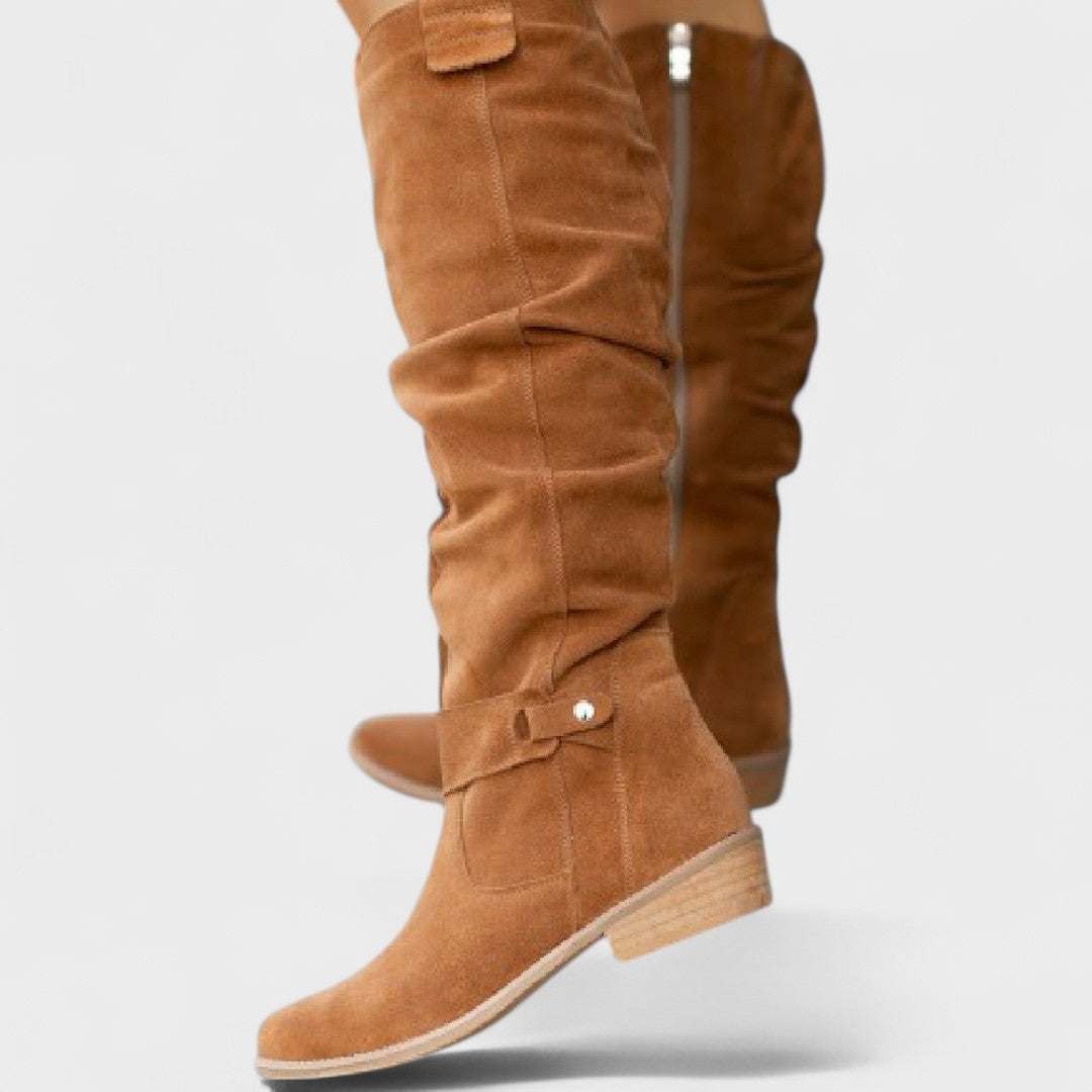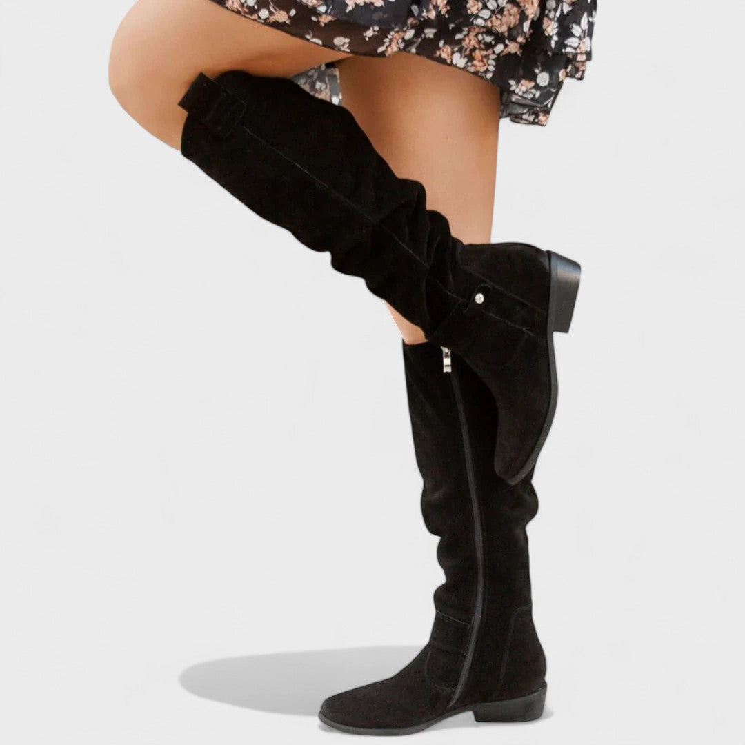 Ove visoke čizme donose urbani šik i udobnost u jednom koraku. Mekano, lagano gornjište s elegantnim naborima prianja uz nogu i pruža opušten, sofisticiran izgled. Bočni patentni zatvarač omogućuje brzo obuvanje, dok niska blok peta nudi stabilnost za cjelodnevno nošenje. Suptilni detalji poput ukrasne kopčice daju dozu profinjenosti koja se lako kombinira s haljinama, suknjama ili trapericama. Savršene za posao, kavu u gradu ili večernji izlazak.