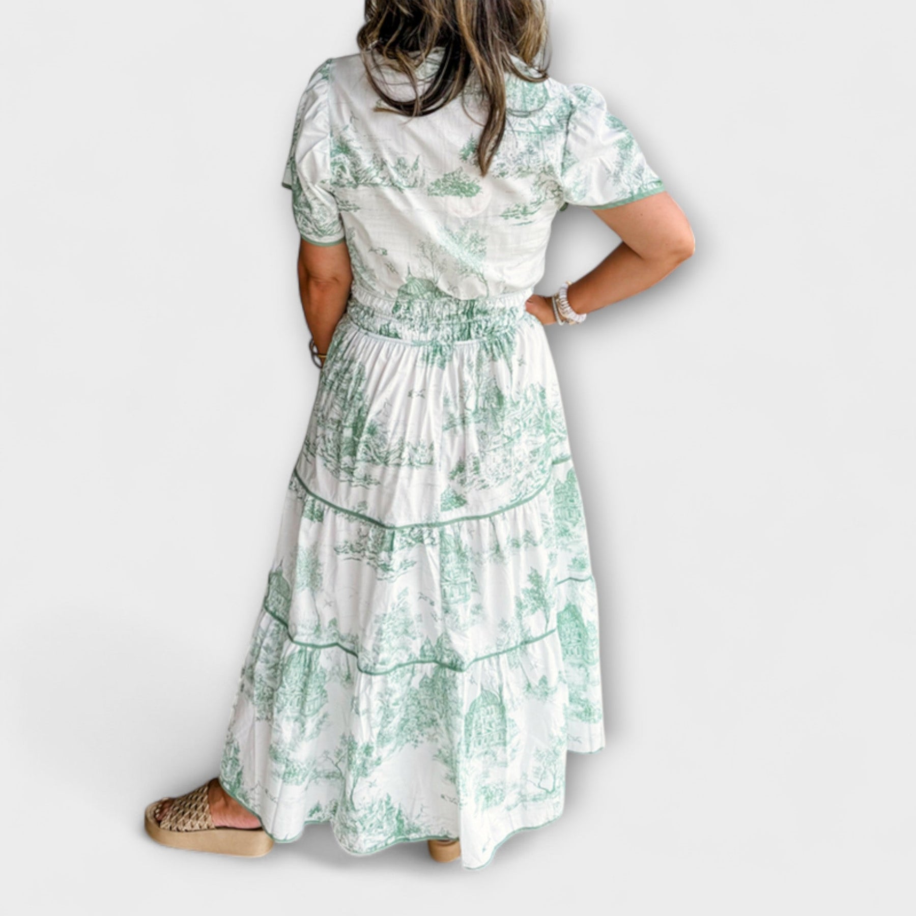 Predstavljanje Eliza | Klasična Toile Maxi – Vaš savršen suputnik za proljetne dane i vrtne zabave! Ovaj bezvremenski komad kombinira beznaporanu eleganciju s ultimativnom udobnošću i ima zapanjujući zeleno-bijeli Toile uzorak koji isijava klasičnu romantiku.