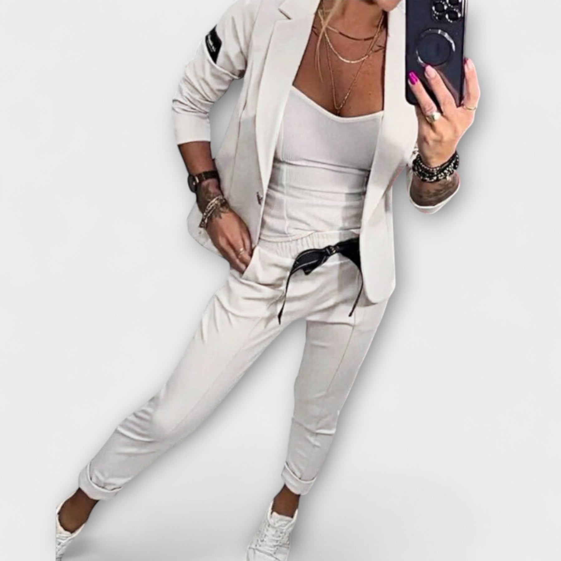 Poboljšajte svoju garderobu našim modernim trodijelnim setom, dizajniranim za suvremenu osobu koja cijeni stil i opuštanje. Ovaj ansambl sastoji se od mekog, prozračnog i laganog materijala koji pruža udobnost tijekom cijelog dana, bez kompromisa u sofisticiranosti.